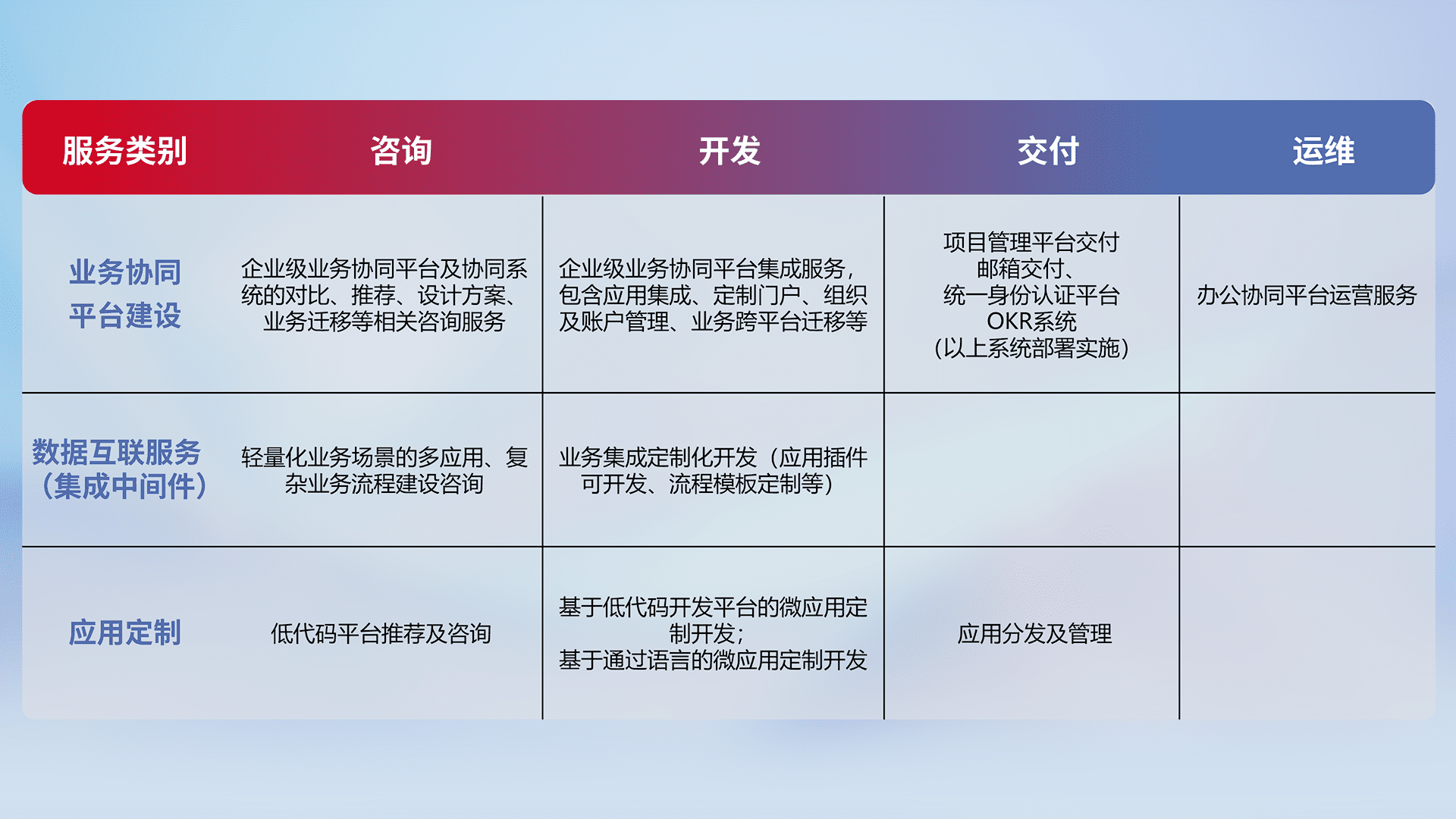 针对钉钉、、、、企微、、IDaas等平台级产品提供产品的规划、、、、方案、、、交付、、定制化开发等服务,,,,实现如统一协同办公、、智能客户服务、、、混合会议管理、、智能数据查询、、等业务场景,,实现数字化转型。。。