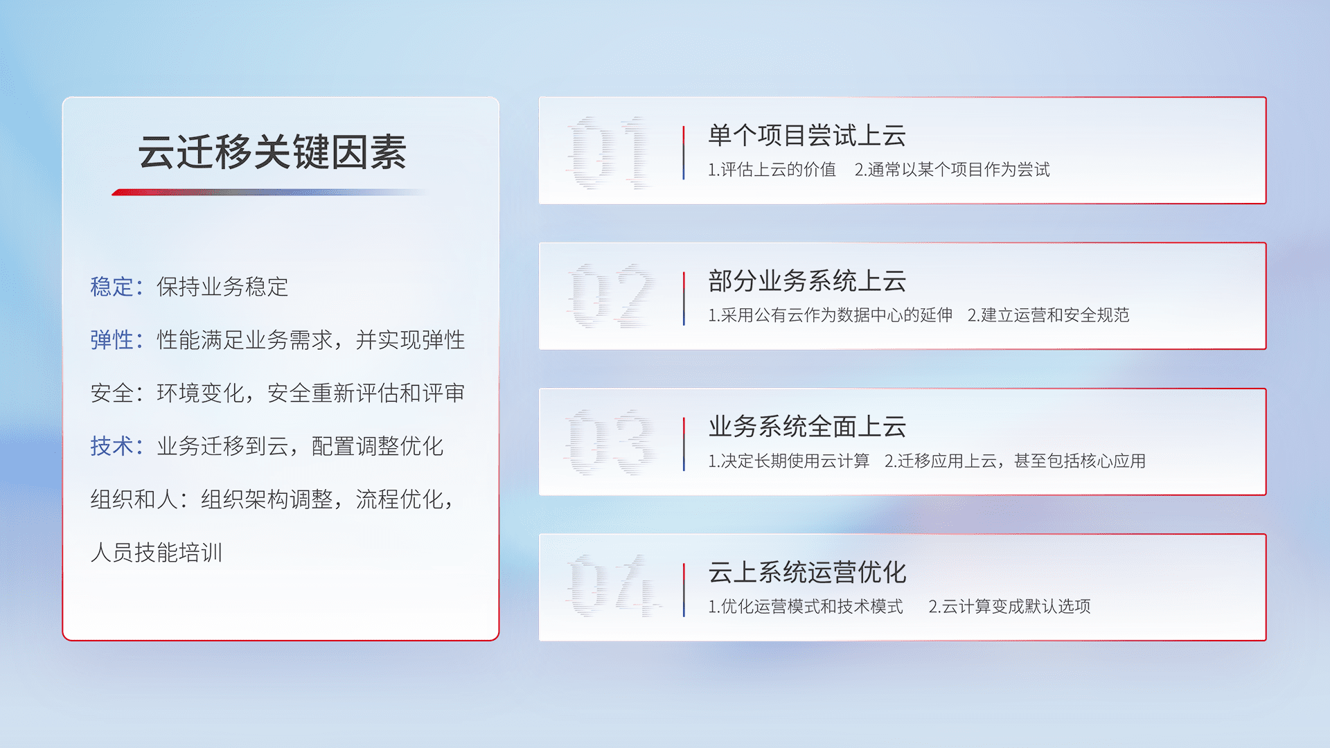结合实际业务,,,,从规划设计、、云平台选型、、、、云原生改造、、数据迁移、、、集成交付,,迁移全过程为客户识别最佳上云路径,,做好风险识别管理,,,设计网络架构、、身份权限、、安全审计合规、、、、操作审计、、、日志审计、、、、监控告警策略、、多站点容灾设计等,,,,对云上基础设施进行整体规划,,,,提升IT治理水平,,以满足弹性、、、高可用、、高性能的需求。。。。