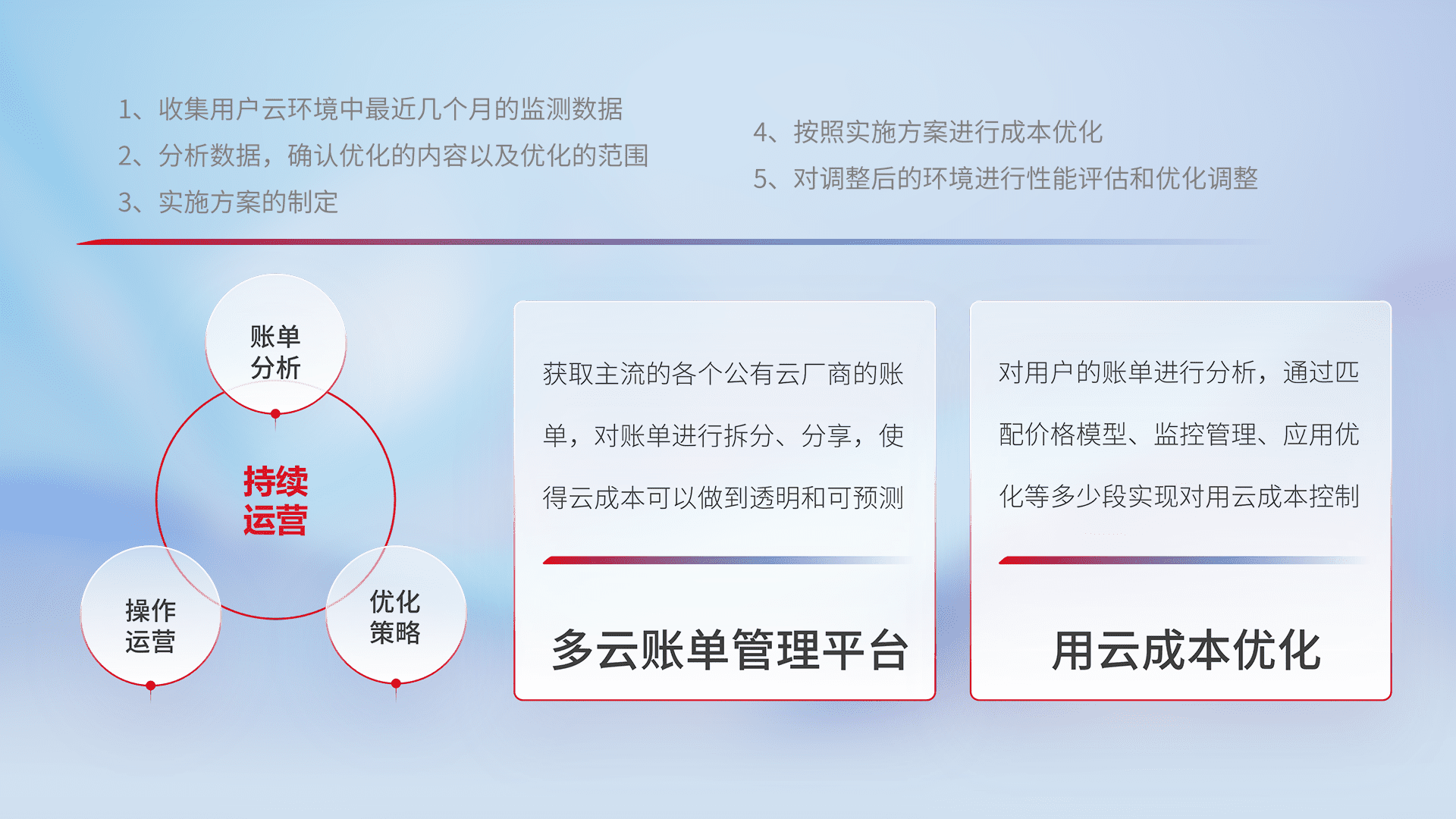 通过多云纳管,,以统一的资源数据模型把客户的云资源进行抽象和封装,,,,进而实现对多云资源的统一操作,,保障云资源管理的可靠性、、稳定性与可用性。。。量身定制化运维内容,,,配置、、、、开发运维、、补丁管理、、、备份、、、监控、、、、认证和访问管理、、、、审计和日常巡检等,,,保障在用云过程中的可靠度,,稳定度以及高可用率。。
